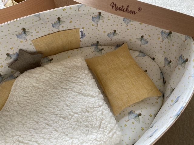 Set aus Nestchen und Kissen für den kleinen Luis aus Hasen mit Regenbögen, kombiniert mit petrolfarbener Decke